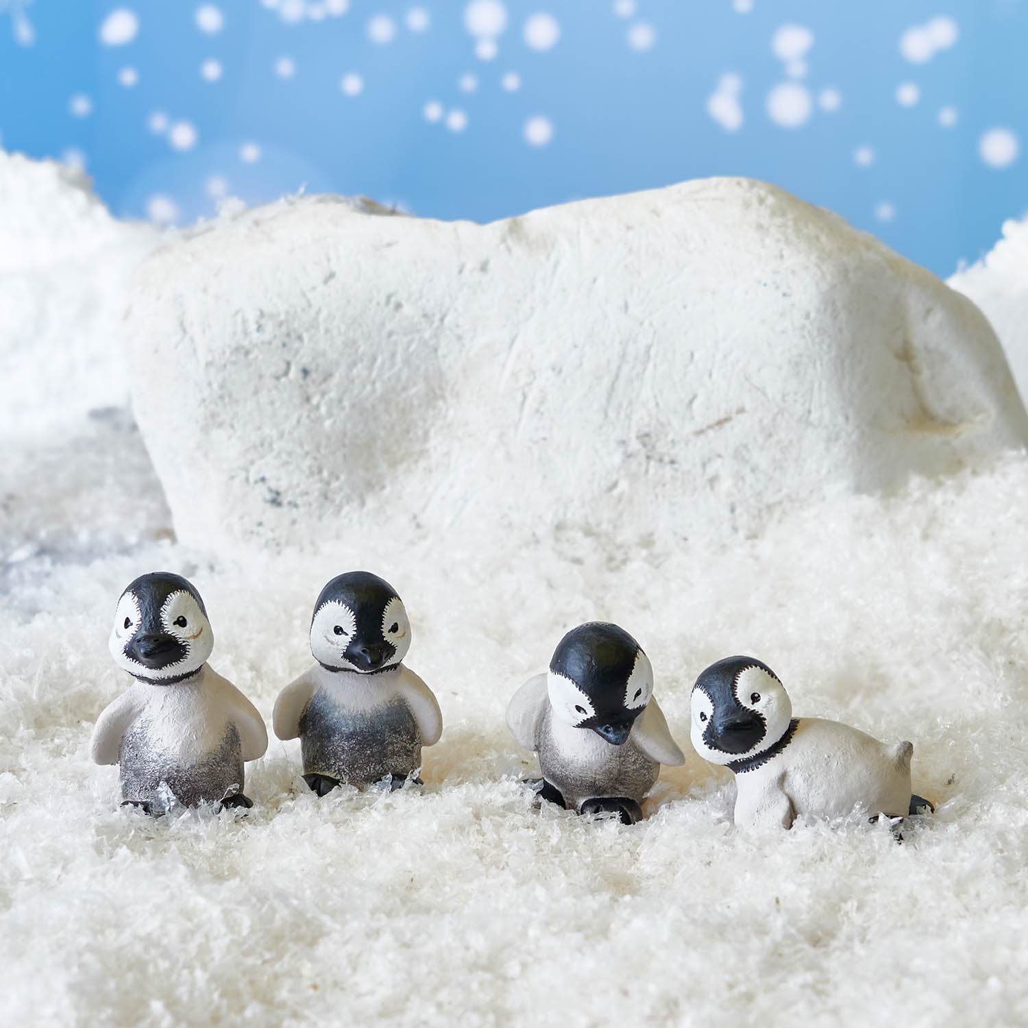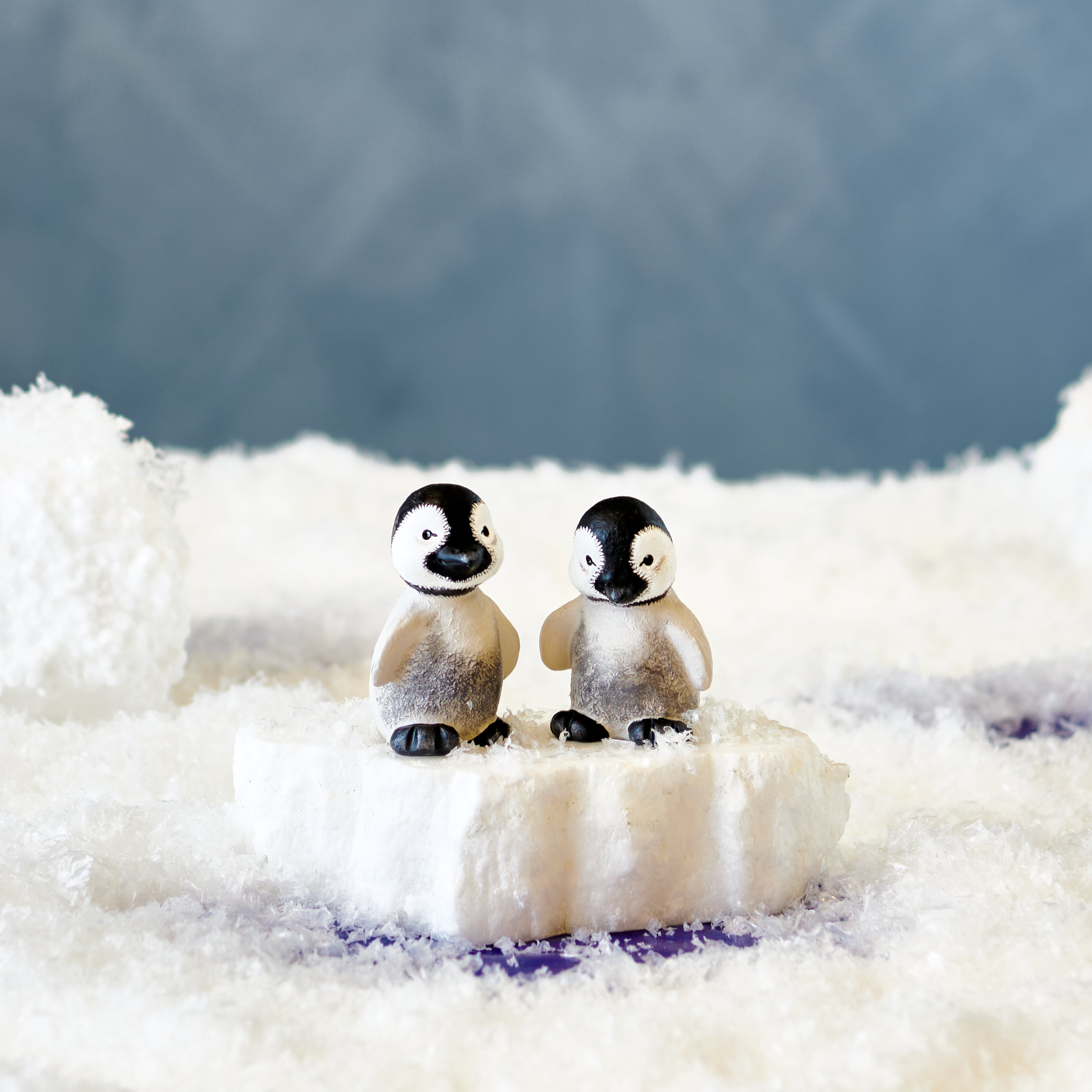 Die zwei kleinen frechen, gefiederten Babypinguine lieben Schnee und Frost. Sie spielen und springen den ganzen Tag im Schnee herum. Erst wenn die Sonne untergeht, werden sie ruhig und machen ein langes Nickerchen.